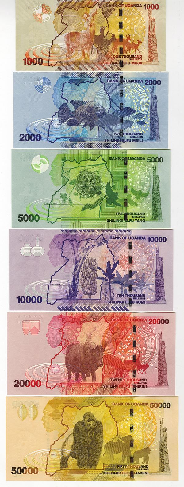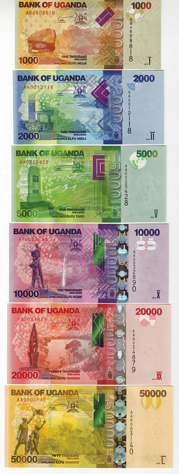 Uganda. Set of 6 issued notes, including 1000, 2000, 5000, 10000, 20000, and 50000 Shillings. P-49a, 50a, 51a, 52a, 53a, 54a. First year of issue. All Choice to Gem Uncirculated. (6). (Arthur C. Matz Collection)