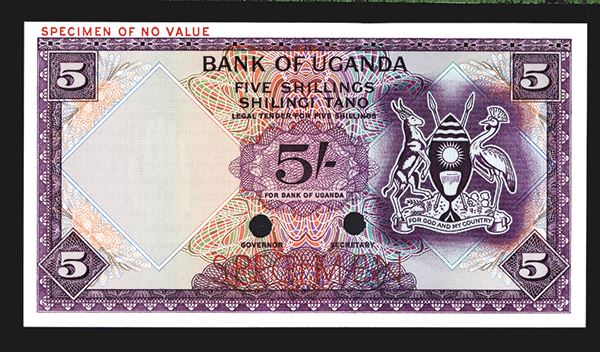Uganda, P-1cts, Specimen banknote, purple on m/c, S/N 73 on back, PMG graded Superb Gem Uncirculated 67 EPQ, this note will be difficult if not impossible to improve upon. The finest known of 2 graded in the PMG census.