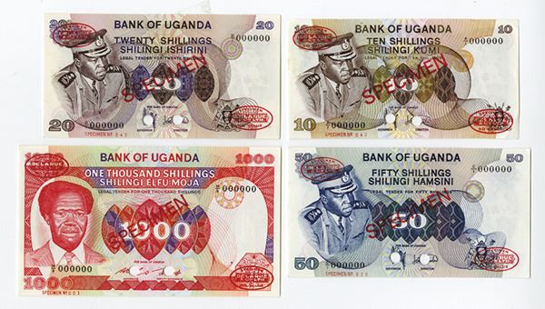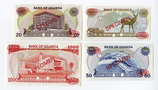 Uganda, Lot of 4 notes, Includes 10; 20 and 50 Shillings, P-6s, P-7s, P-8s and P-23as, Idi Amin at left, Red Oval TDLR Specimen overprints on face and back. S/N A/1; B/1; C/1 and H/9 prefix, S/N's 000000, POC's, Rare as a specimen in this format. AU/Uncirculated with light mounting remnants on back right. TDLR.