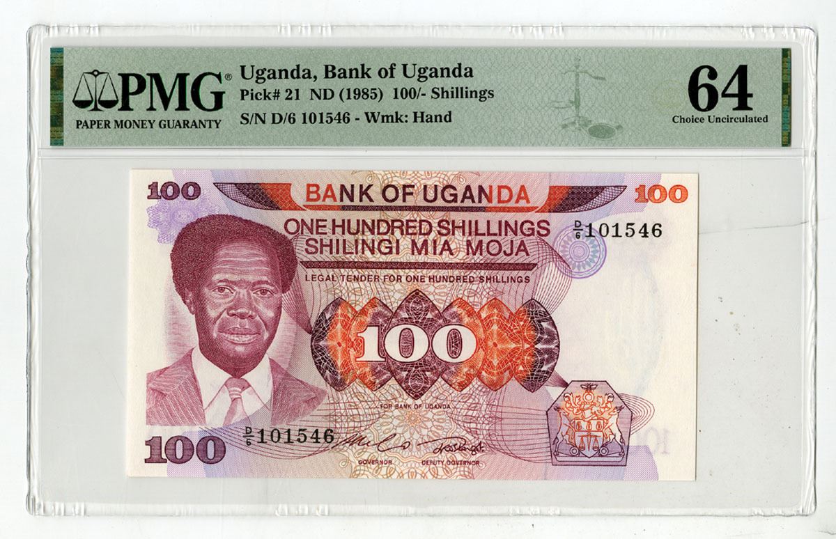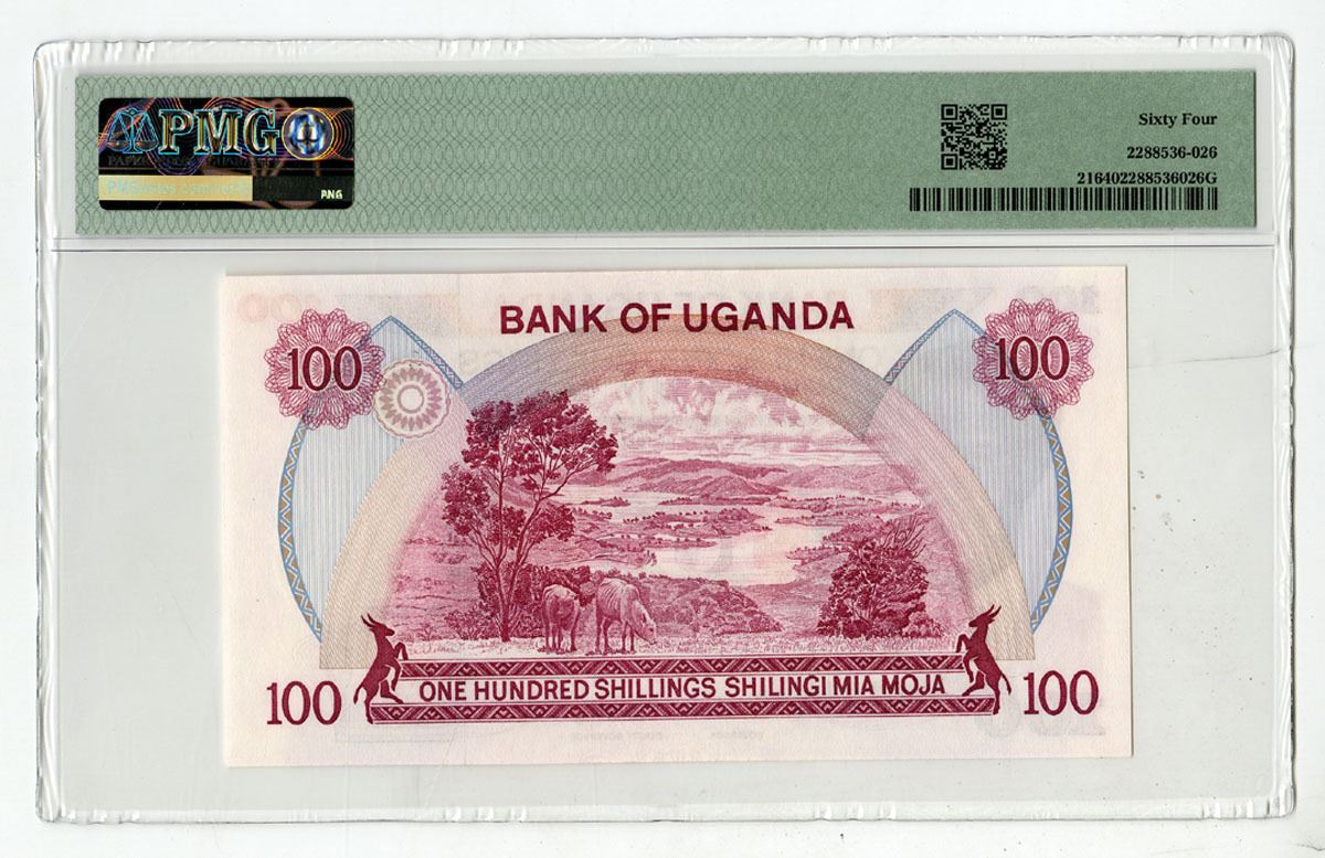 Uganda, ND (1985). 100 Shillings, P-21, Issued Banknote, Red-violet and orange on m/c underprint, Portrait of President Obote at left, Back is maroon and m/c with scene of lake and hills at center, S/N D/6 101546, PMG graded Choice Uncirculated 64.