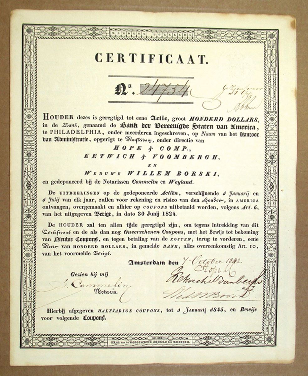 Amsterdam, Netherlands, 1842. 100 Dollars, I/U Coupon Bond for the Bank of the United States located in Philadelphia, Black printing with simple black border printed on thick paper, Printed in Dutch, S/N 24754, Coupons attached, VF to XF condition.