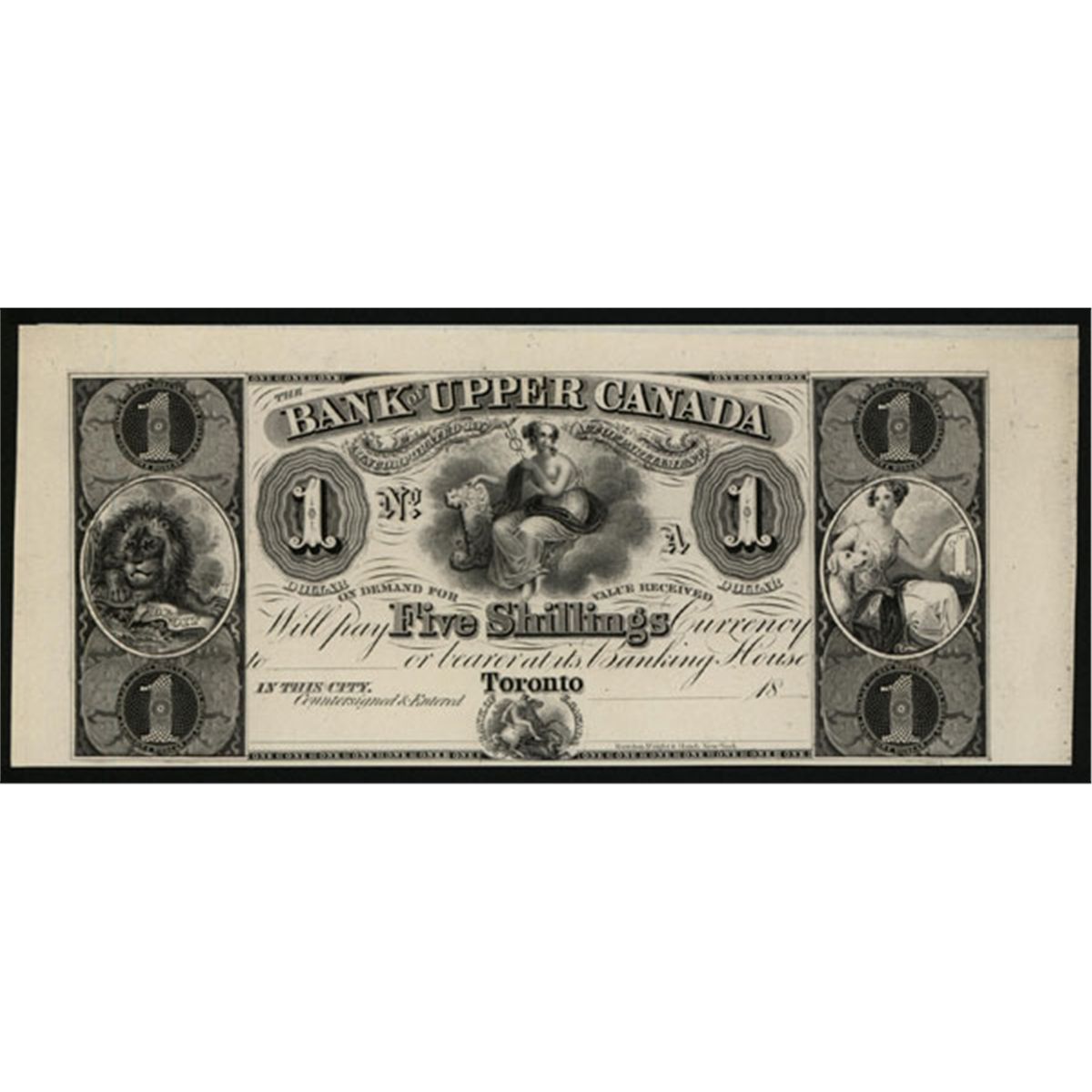 TToronto, Canada, 18xx (ca.1830's), $1 = 5 Shillings, Plate A, CH-770-14-02P, Proof banknote, black on india paper on thin white card, Topless allegorical woman with Cadaceaus and numeral 1 in middle under title with lion on left and allegorical woman with dog on right, CU to Gem Uncirculated condition with 3 jumbo margins on top and sides and ample on bottom, Rawdon, Wright & Hatch, New York imprint. (Silver City Collection, Part 2)