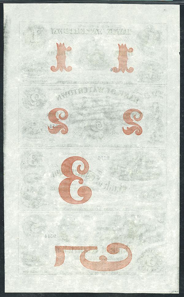 Watertown, WI., $1-$2-$3-$5, WIS-825X2, Unissued remainder sheet, Allegorical women, Arms and various vignettes on each denomination, All with red protectors, the $5 with a lazy "5" protector, S/N 9514, PMG graded Gem Uncirculated 66 EPQ, attractive sheet rarely found in this high of grade. TCC&C with ABNC monogram. A lovely Wisconsin sheet