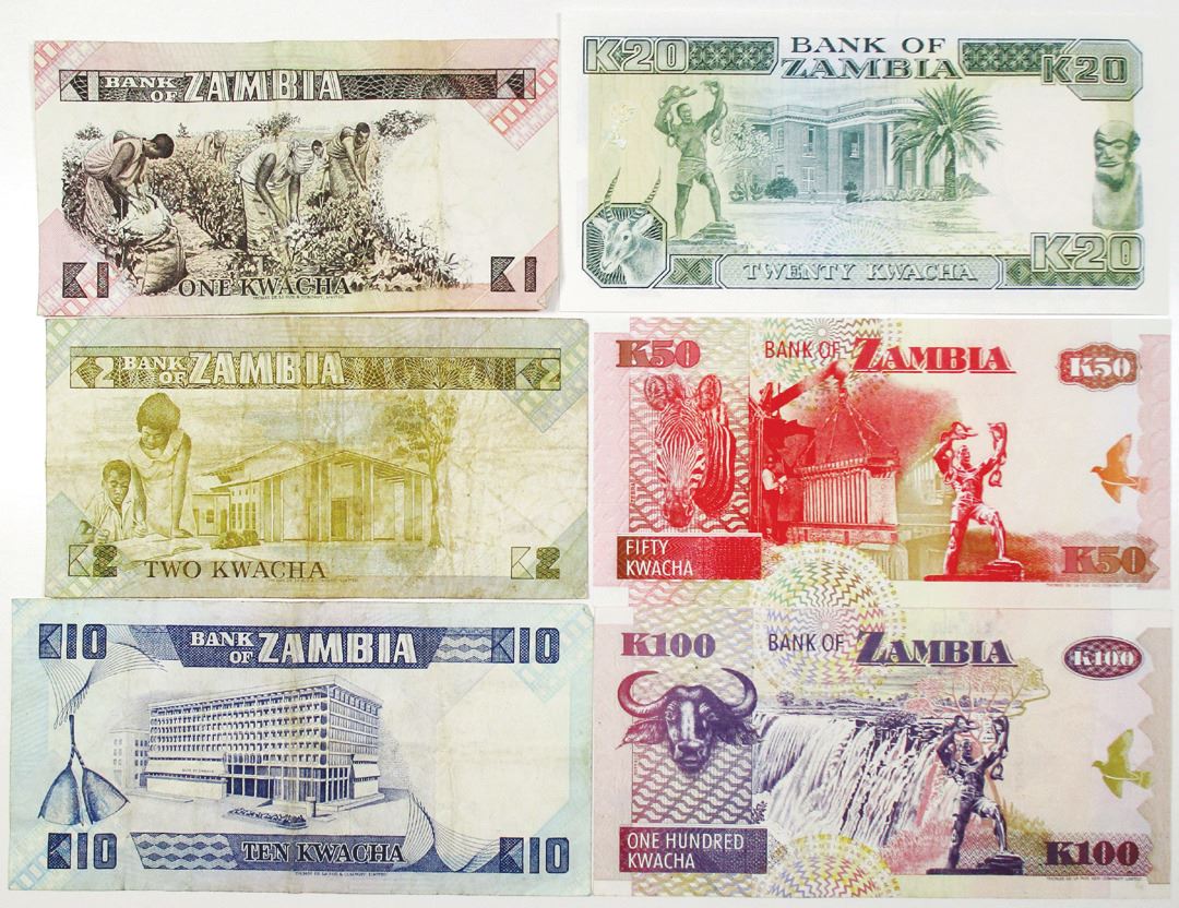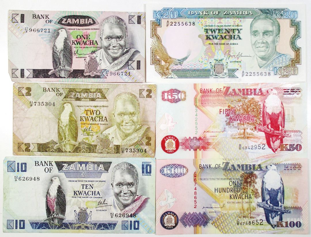 Zambia... 1980-1992. 1, 2, 10, 20, 50, and 100 Kwacha, P-23a; 24b; 26d; 32b; 37a; 38a, issued banknote group, Fine to XF (6).
