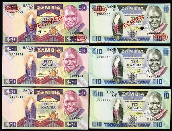 Bank of Zambia. Group of 19 Banknotes. Zambia. Pick #23a, s, 24a, b, c, 25a, c, d, s, 26a, b, d, e, s, 27d, e, 28a, r, s. Issued notes, Replacement notes, and Specimens. Many signature varieties included. All Choice AU to Uncirculated or better.