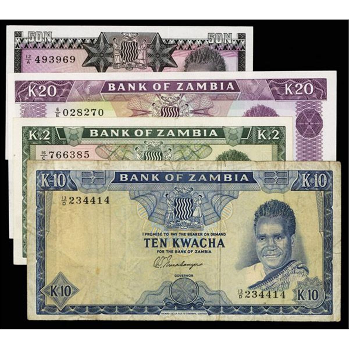 Zambia, Lot of 4 notes, Includes 1973, 50 Ngwee, P-14a, Unc.to CU; 1968, 2 Kwacha, P-6a, VF to Choice VF with 2 pin holes, scarce note; 10 Kwacha, P-12b, Signature 3, Fine to Choice Fine; 20 Kwacha, P-13c, Signature 4, Uncirculated to CU condition. Attractive quartet of notes. TDLR.
