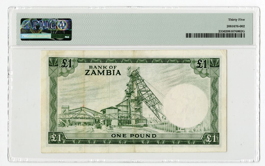 Zambia. ND (1964). 1 Pound, P-2, Issued banknote, Green on multicolor underprint, S/N B/6 288246, Watermark: Wildebeest's Head, PMG graded Choice Very Fine 35. Printer: TDLR.