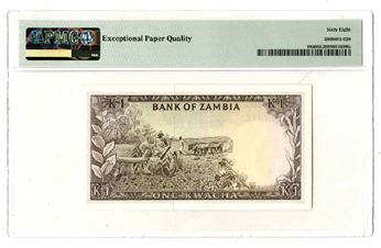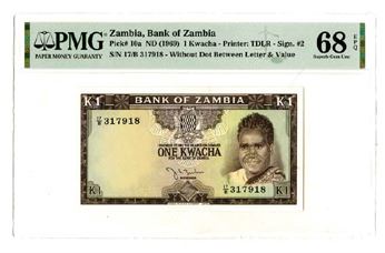 Zambia, ND (1969). 1 Kwacha, P-10a, Issued banknote, Dark brown on multicolor underprint, S/N 17/B 317918, Sign. #2, Without Dot Between Letter & Value, PMG graded Superb Gem Uncirculated 68 EPQ. Printer: TDLR. This is the highest graded example out of 9 graded in the PMGF census.