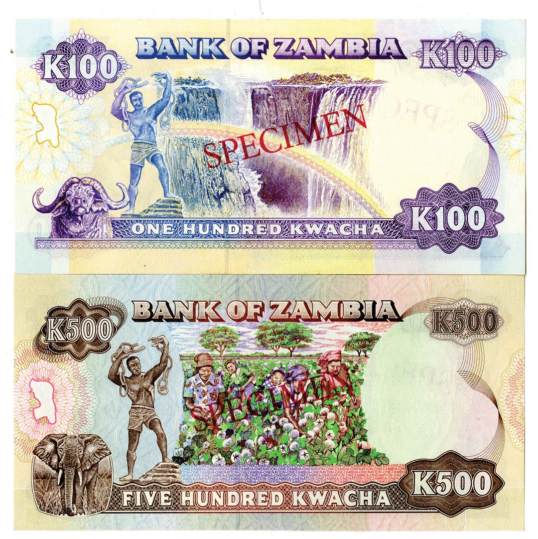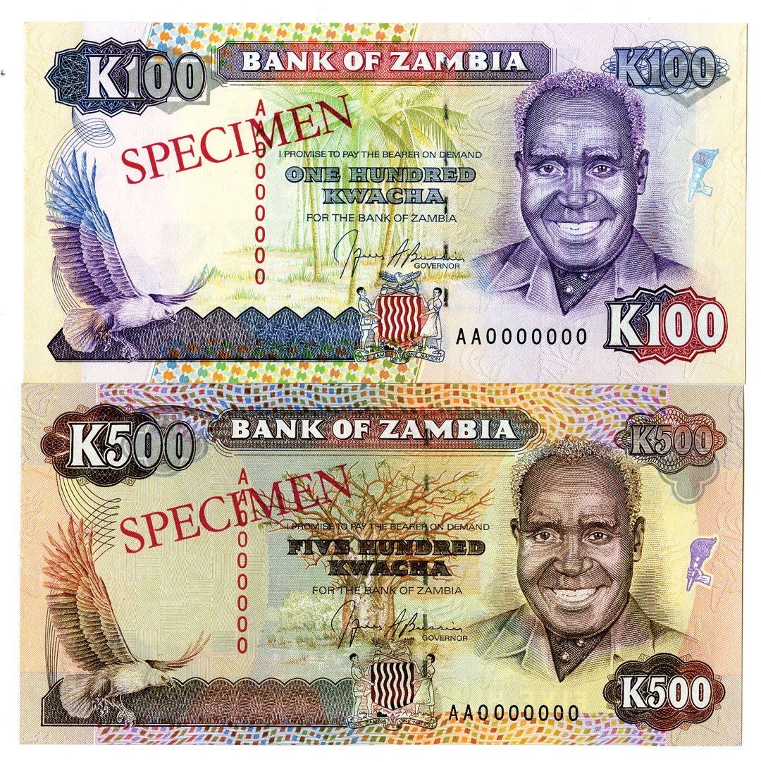 Zambia...., ND (1991). 100 and 500 Kwacha, P-34as; 35as, specimen banknote, s/n AA0000000 and "SPECIMEN" overprints, Choice to Gem Unc (2). (From the Allen Berk Collection)