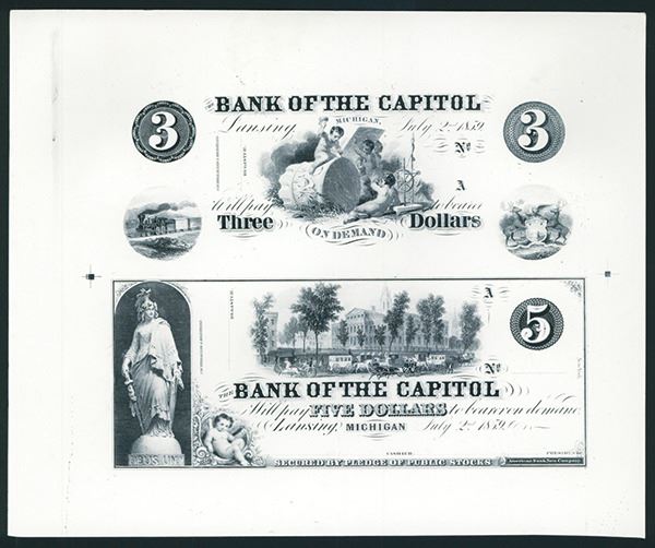 Lansing, Michigan. Uncut sheet of 2 notes, (uncut sheet of 2 of the vignette and text), 1859 (ca.1960-70's), $3-5, (MI-230-G2a ($5); $3 not listed in Haxby), Modern "Proprietary Proofs". The $3 proof has locomotive on lower left, cherubs making marble columns in middle and Michigan arms on right; the $5 note has statue of Liberty on left, large buildings with horse and buggies in middle and numeral 5 on lower right. Black printing without underprint, printed on thin white card, Uncirculated condition. ABNC. Archival "Proprietary" proofs rarely seen in sheet form. (ABN Commemoratives, AIA XI, May 15, 2012)