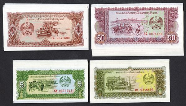 Lao. 5, 10, 20, 50 Kip. P-26r (13); 27r (9); 28r (8); 29r (10). National arms at left or right end. All Replacement notes. All Choice Uncirculated. 40 pieces.