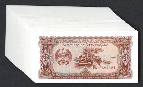 Lao. 20 Kip P-28r (68). Tank at center soldiers marching along side. Textile mill on back. All with replacement serial # prefix EA. Many in consecutive serial # groups. Mostly AU to Choice Uncirculated. 68 pieces