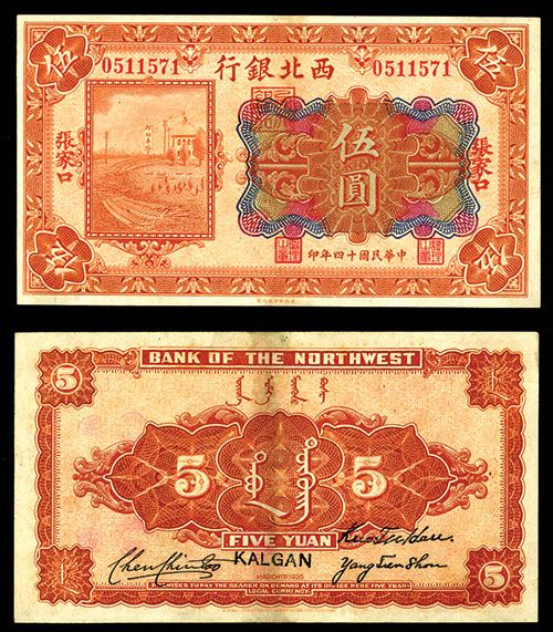 Kalgan, China, 1925, 5 Yuan, P-S3874b (S/M #H77-33b), Issued banknote, orange on m/c, railroad track laying on left, back orange, PMG graded About Uncirculated 55, Only 6 graded by PMG with only two graded higher.