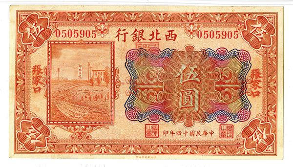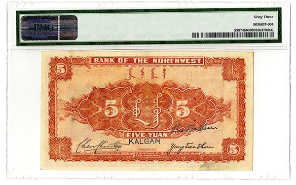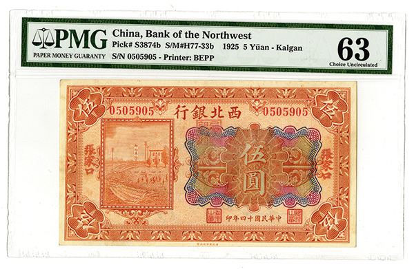Kalgan, China. Issued 5 Yuan, P-S3874b, S/M#H77-33b, PMG graded Choice Uncirculated 63. BEPP.