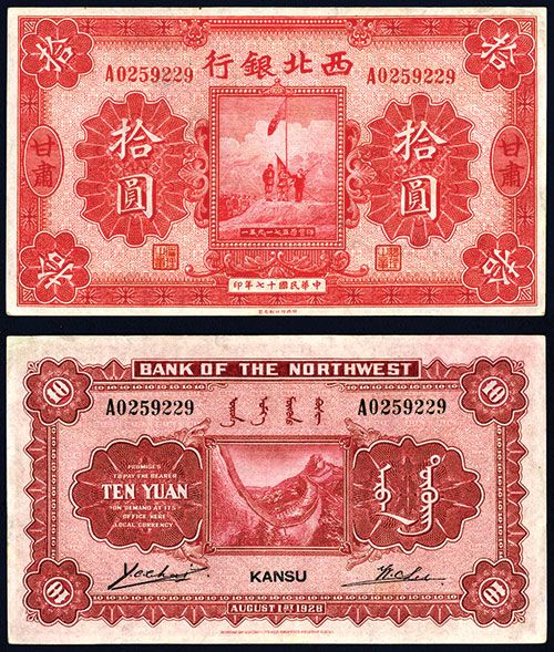 Kansu, China. 10 Yuan, P-S3889f Unlisted Branch (S/M#H77-62-), Issued banknote, Red with troop oath in middle, back red, S/N A 0259229, PMG graded About Uncirculated 55, rare note if not unique. This is the only one graded in the PMG census and was previously unlisted in the SCWPM.