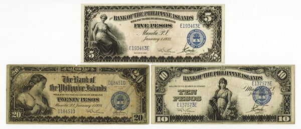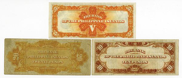 Philippines. Lot includes from the Series of 1928 issued 20 Pesos, P-18, Fine; from the Series of 1933 issued 5 Pesos, P-22, Extremely Fine; and 10 Pesos, P-23, Choice Fine. USBEP.