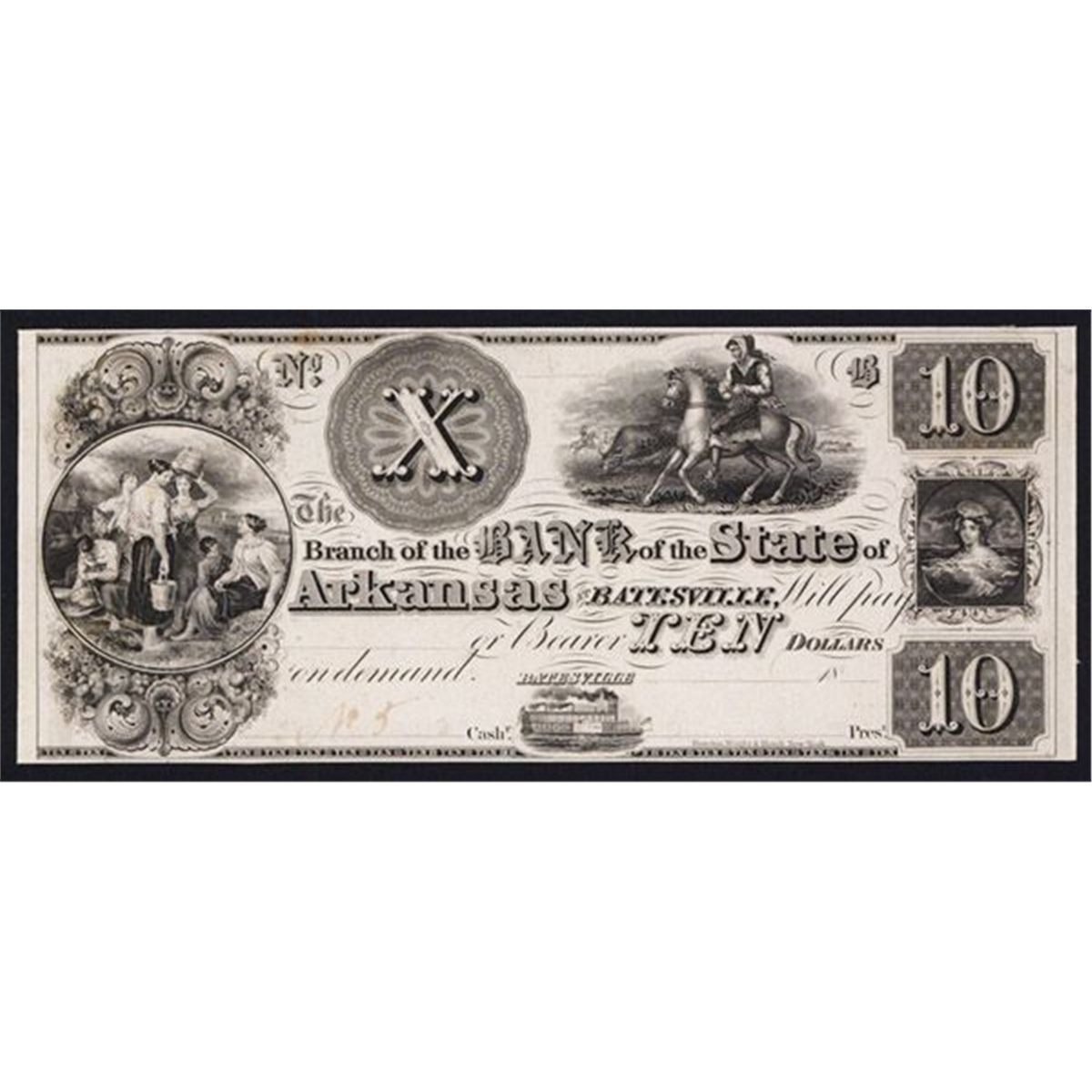 Batesville, Arkansas, 18xx (ca.1830's), $10, Plate B, AR-10-G122, Unlisted in Census, Proof banknote, black on india paper on thin white card with 3 jumbo margins on top and sides and normal margin on bottom, Woman on horseback top right, young woman in water on right and farm women resting on left with small steamboat on bottom, Au to Uncirculated with light wrinkles on the edges due to glue, No.5 written on the lower left signature block, POC's, Rawdon, Wright & Hatch, New York imprint. (Silver City Collection, Part 2)