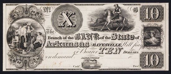 Batesville, Arkansas, 18xx (ca.1830's), $10, Plate B, AR-10-G122, Unlisted in Census, Proof banknote, black on india paper on thin white card with 3 jumbo margins on top and sides and normal margin on bottom, Woman on horseback top right, young woman in water on right and farm women resting on left with small steamboat on bottom, Au to Uncirculated with light wrinkles on the edges due to glue, No.5 written on the lower left signature block, POC's, Rawdon, Wright & Hatch, New York imprint. (Silver City Collection, Part 2)