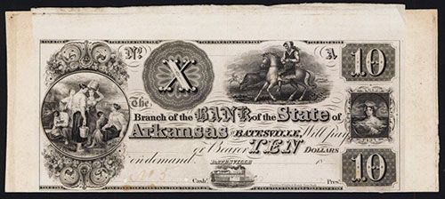 Batesville, Arkansas, 18xx (ca.1830's), $10, Plate A, AR-10-G122, Unlisted in Census, Proof banknote, black on india paper on thin white card with 3 jumbo margins on top and sides and normal margin on bottom, Woman on horseback top right, young woman in water on right and farm women resting on left with small steamboat on bottom, Au to Uncirculated with light wrinkles on the edges due to glue, No.5 written on the lower left signature block, POC's, Rawdon, Wright & Hatch, New York imprint. (Silver City Collection, Part 2)