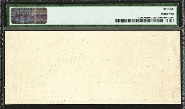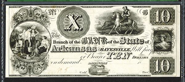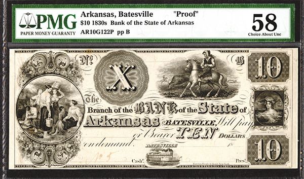 Batesville, Arkansas, 18xx (ca.1830's), $10, Plate B, AR-10-G122, Unlisted in Census, Proof banknote, black on india paper on thin white card with 3 jumbo margins on top and sides and normal margin on bottom, Woman on horseback top right, young woman in water on right and farm women resting on left with small steamboat on bottom, PMG Graded Choice About Uncirculated with light wrinkles on the edges due to glue, No.5 written on the lower left signature block, POC's, Rawdon, Wright & Hatch, New York imprint. (ex-Silver City Collection, Part 2, Archives International Auctions)