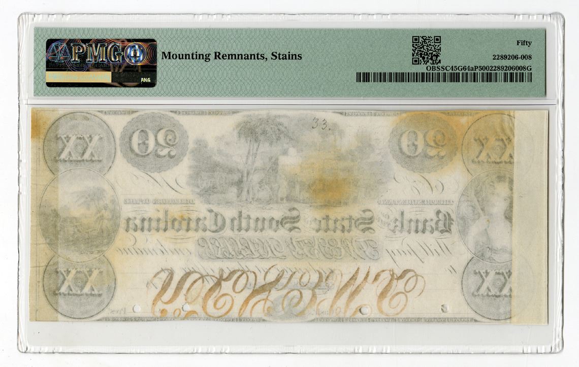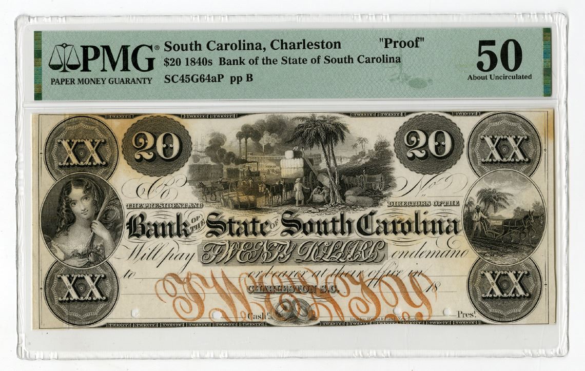Charleston, South Carolina, 1840s. $20, SC-45-G64aP, Proof Banknote printed on india paper, Uniface note with black and gold print, Multiple vignettes including: Dock scene with steamboat in the background and bales of cotton, Slaves plowing field at right and allegorical woman at left, No S/N, pp B, PMG graded About Uncirculated 50 with comments "Mounting Remnants" and "Stains," RW&H.