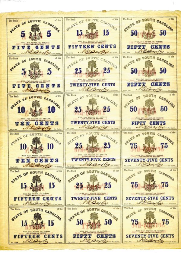 South Carolina. Feb. 1, 1863, Uncut sheet of 18 note, 5ct-5ct-10ct-10ct-15ct-15ct-15ct25ct-25ct-25ct-25ct-50ct-50ct-50ct-50ct-75ct-75ct-7ct. A; are signed and issued, black with blue denomination overprint, palmetto tree in middle, backs with red denomination printed, watermarked WT&Co, one of the 15cents notes has the "FRB error instead of "FEB", mostly XF to AU condition due to folds from previous storage, still the paper is crisp and fresh. Scarce as uncut sheet.