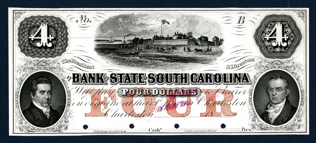 Charleston, South Carolina, $4, (SC-45-G42B), Black with red protector, Fort at top middle, Male portraits left and right bottom corners, POC's, printed on india paper, Choice to Gem Uncirculated with the purple hand stamp partially showing through the face, otherwise large even margins, sharp corners and bright vivid blacks. BA-BC.
