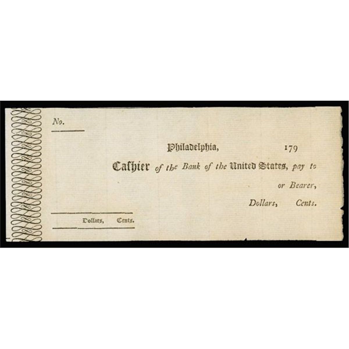Philadelphia, Pennsylvania. 179x, Unissued check, black on off white ribbed paper, ornate indent at left border, Uncirculated condition with toning. Attractive and early U.S. fiscal item.