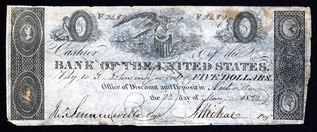 Nashville, Tennessee, 1832, $5, US-1-G518 Counterfeit, SENC, Office and Discount and Deposit in Nashville, TN. Issued and uncancelled. Eagle, arrows and shield. XF condition. Scarce note. FDU. (East Bay Collection).
