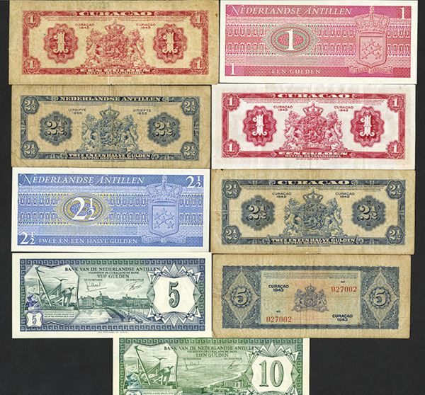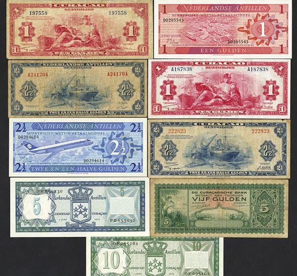 Netherlands Antilles. 1, 2-1/2, 5, 10 Gulden. Wide range of types and dates. 9 pieces.