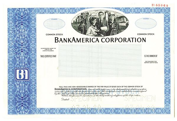 Delaware, 1980. Odd Shares Specimen Stock Certificate, Black text with blue border and undertint, Quartet of allegorical people in lab at top center. Specimen overprints, VF condition, SC-USBN. The Bank of America Corporation (simply referred to as Bank of America, often abbreviated as BofA) is an American multinational investment bank and financial services holding company. Bank of America was formed through NationsBank's acquisition of BankAmerica in 1998. It is the second largest banking institution in the United States, after JPMorgan Chase, and the eighth largest bank in the world.