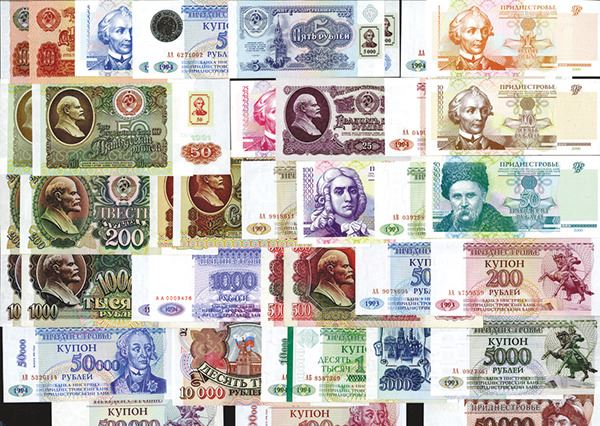 Transnistria. Complete regular issue variety set. 1994 Provisional Issues with stickers SCWPM 1a-15a; Kupon Issues SCWPM SCWPM 16-33; 2000 Issue SCWPM 34-39. All Choice Uncirculated (but for #10 which is VF+). 40 pieces. (Arthur C. Matz Collection)