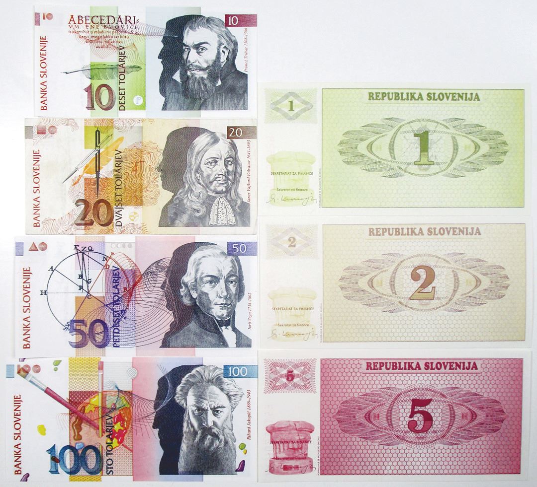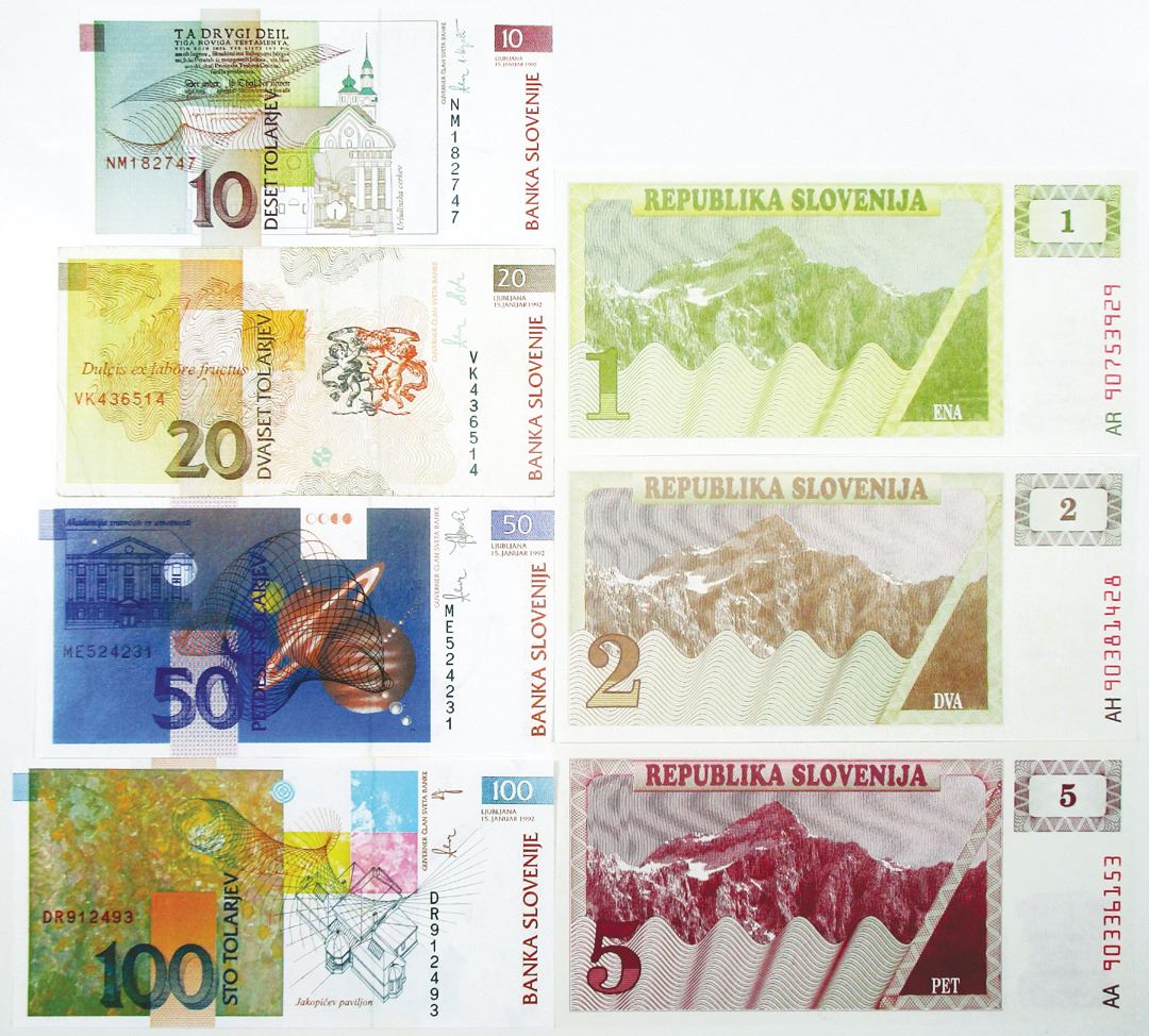 Sloveniaƒ. 1990-1992. 1,2, 5, 10, 20, 50, and 100 Tolarjev, P-1a; 2a; 3a; 11a; 12a; 13a; 14a, issued banknote septet, VF to Unc (7).