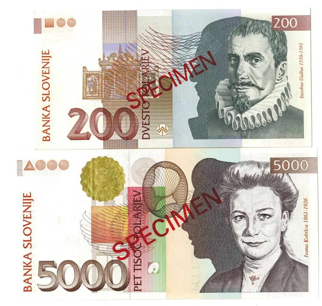 SloveniaÉ... Pair of 200 & 500 Tolarjev banknotes, both overprinted SPECIMEN / VZOREC and bearing serial numbers 000000. TDLR. P-15bs; 21as. Choice to Gem Unc. (2)