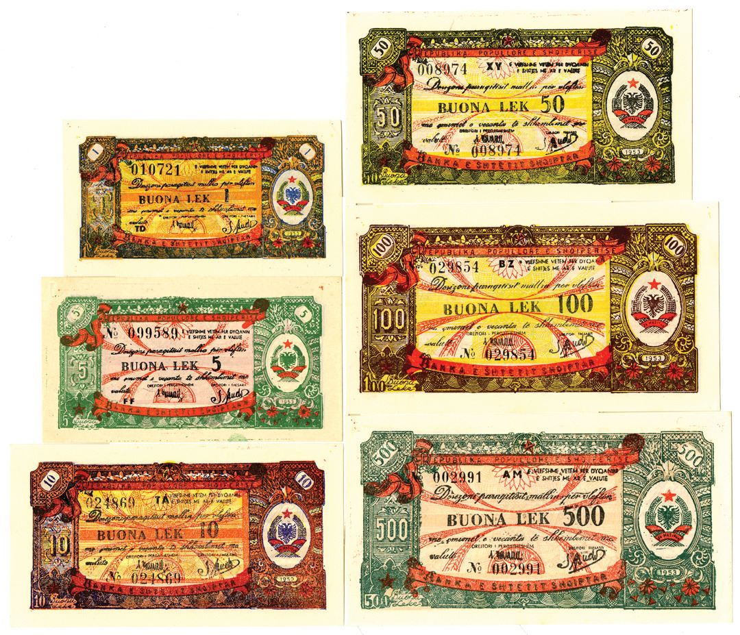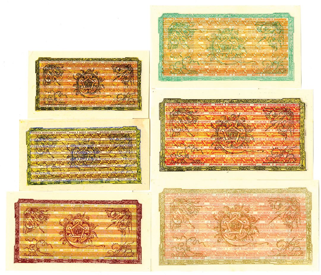 Albania. 1953. 7 Issued banknotes: 1 Lek FX4; 5 Lek FX5; 10 Lek FX6; 50 Lek FX7; 100 Lek FX8; 500 Lek FX9. XF to Choice AU Condition or better. (7)