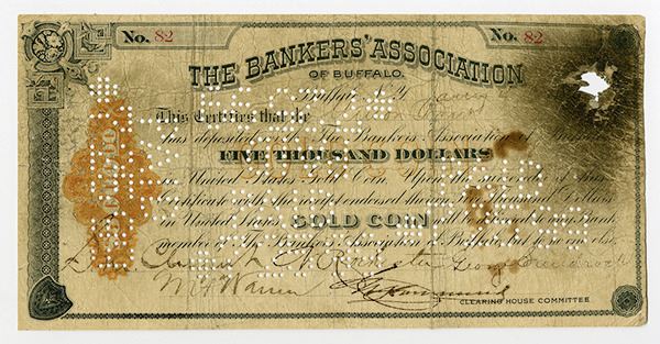 New York. Clearing House Certificate for $5000. Endorsed in 1899 on back. S/N 82, Perforated Cancelled. Excessive counting handling on right with small hole on upper right. Very Good +.