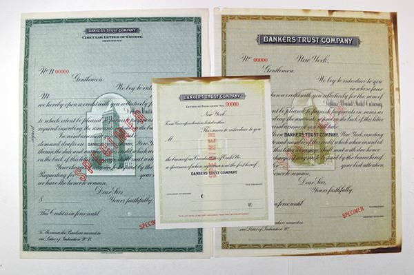 New York. Green and olive-brown ABNC Letter of Credit Specimen (only second with the ID card. Plus 6 facsimile signature fliers 1917-1927 and one additional letter on letterhead. All but the first LOC have paper tone on the edges. Great vignette of this famous Wall Street building.