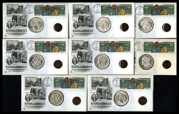 Banking & Commerce First Day Covers with Coins October 6, 1975. Each cover includes stamps, a Morgan Silver Dollar AU-Unc; and an Indian Cent VG or Better. [8 pieces.], weight approximately 1 lb.
