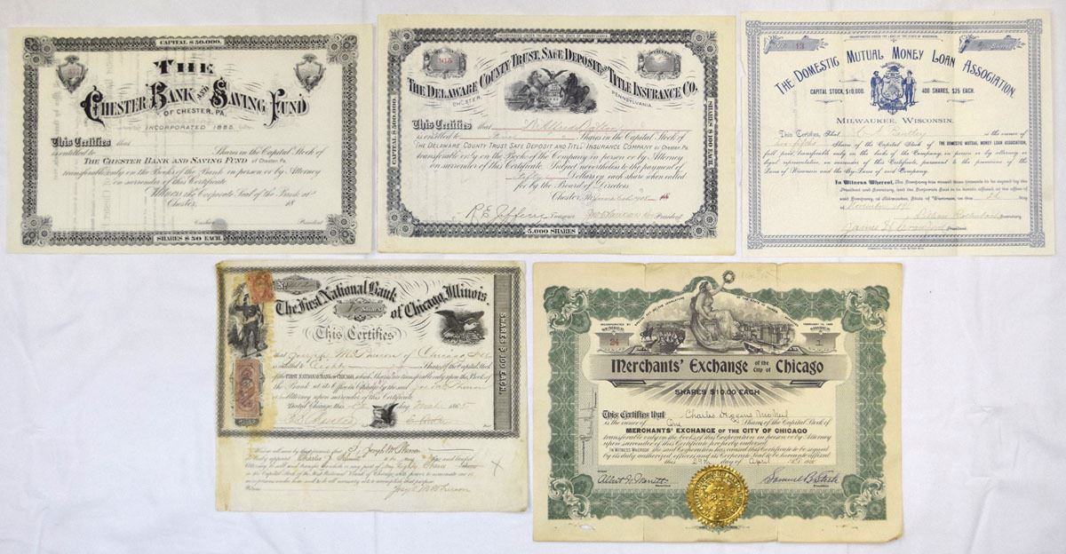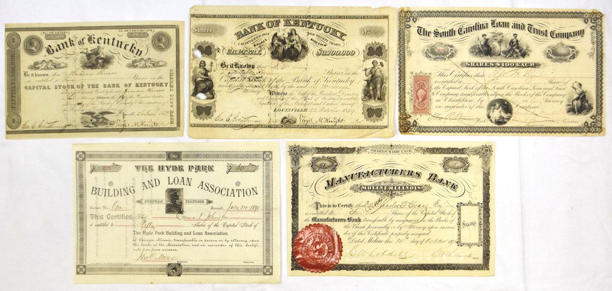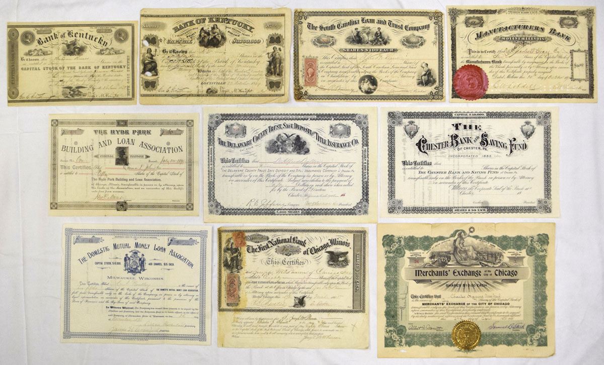 Various States...., Lot of 10 Issued Stock Certificates representing banking and finance institutions, Includes: Bank of Kentucky (2); Manufacturers Bank; South Carolina Loan and Trust Company; Hyde Park Building and Loan Association; The Chester Bank and Saving Fund; Delaware County Trust, Safe Deposit and Title Insurance Company; Domestic Mutual Money Loan Association; Merchants’ Exchange of the City of Chicago; and First National Bank of Chicago. Designs feature allegorical figures, bank buildings, city views, and ornate engraved borders, with several examples bearing imprinted or adhesive revenue stamps, embossed seals, manuscript signatures, and cancellation markings. Conditions range from VG to VF overall, with typical folds, handling wear, light soiling, edge wear, and minor faults consistent with age. (10). Sold “AS IS” no returns accepted.