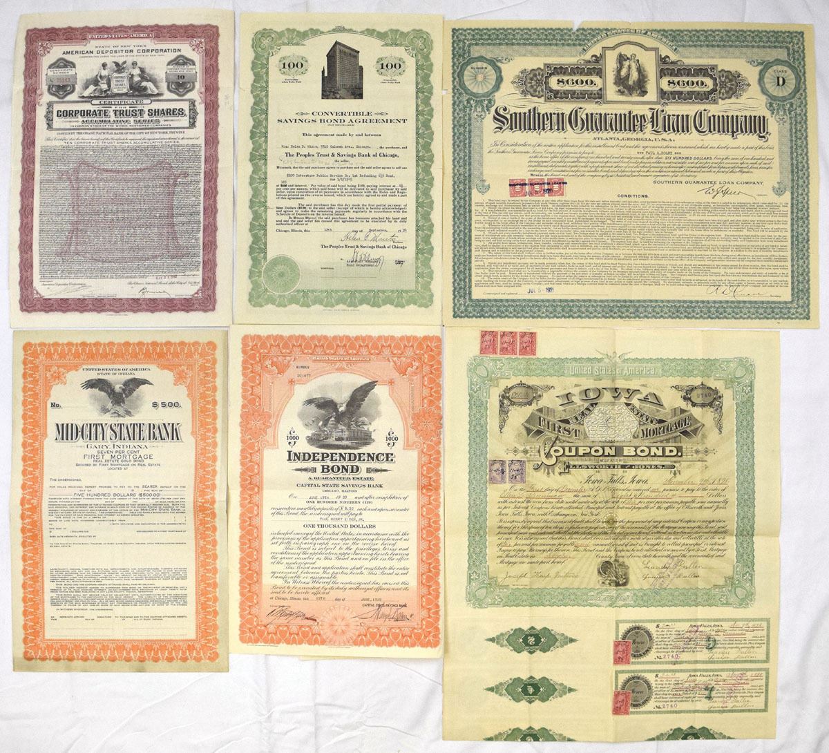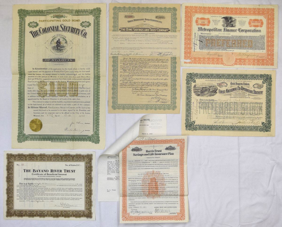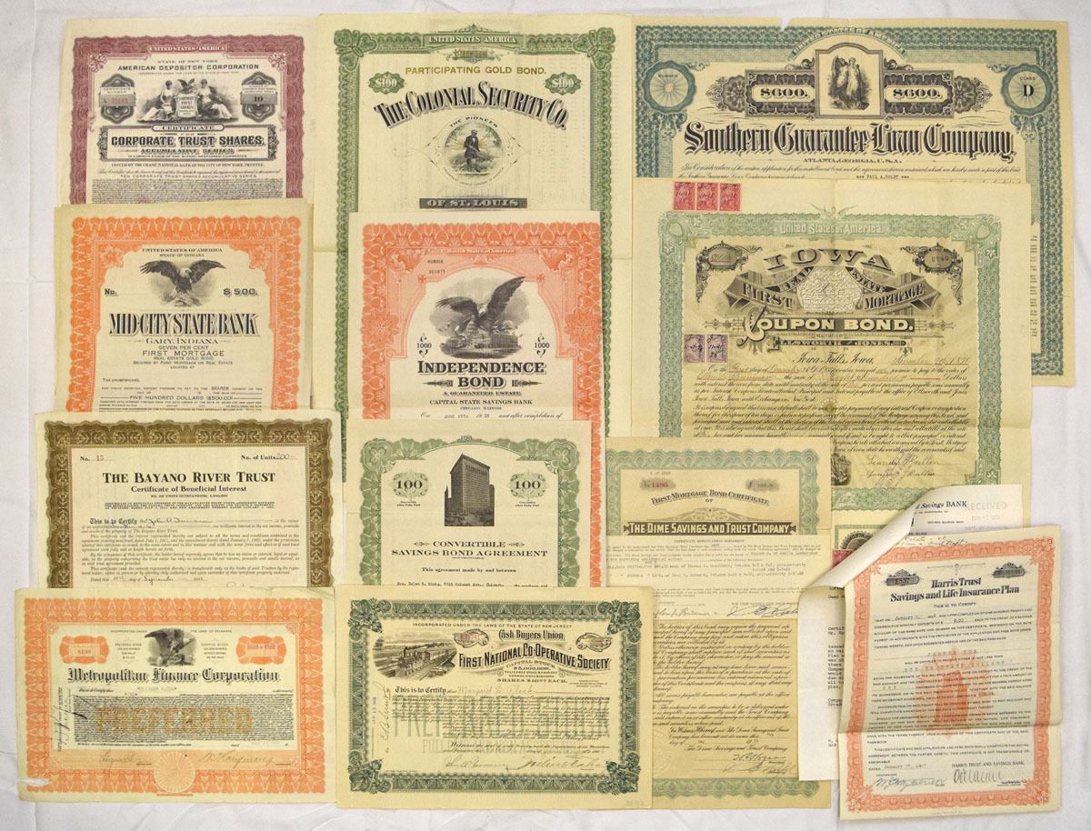 Various States...., Lot of 12 financial instruments, including bonds, trust certificates, savings agreements, and insurance-related documents representing early 20th-century American banking, finance, and investment activity. Includes examples from American Depositor Corp.; The Colonial Security Co.; Southern Guaranty Loan Co.; Mid-City State Bank; Capital State Savings Bank; The Dime Savings and Trust Co.; Harris Trust and Savings Bank; Metropolitan Finance Corp.; First National Co-Operative Society; and Bayano River Trust. Conditions range from VG to VF overall, with folds, handling wear, cancellations, punch cancels, stamps, and edge wear present on some items. (12). Sold “AS IS” no returns accepted.
