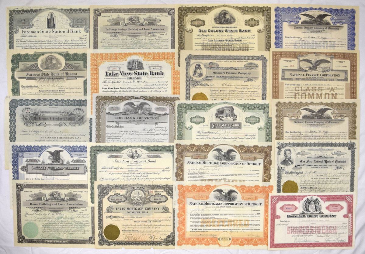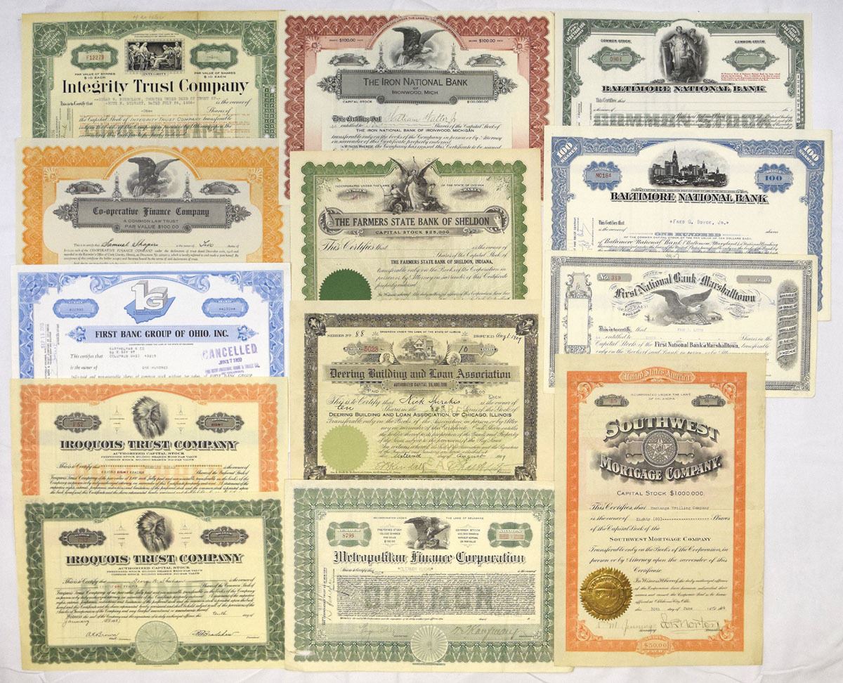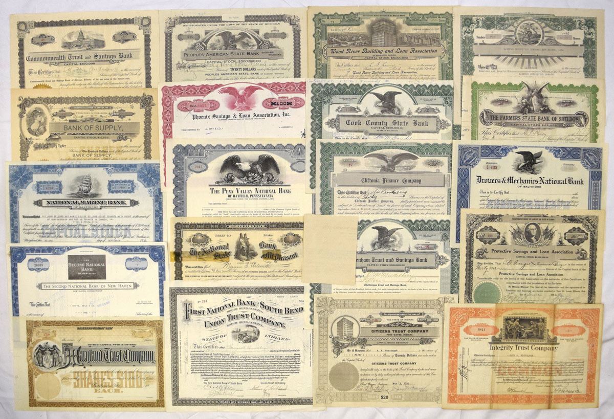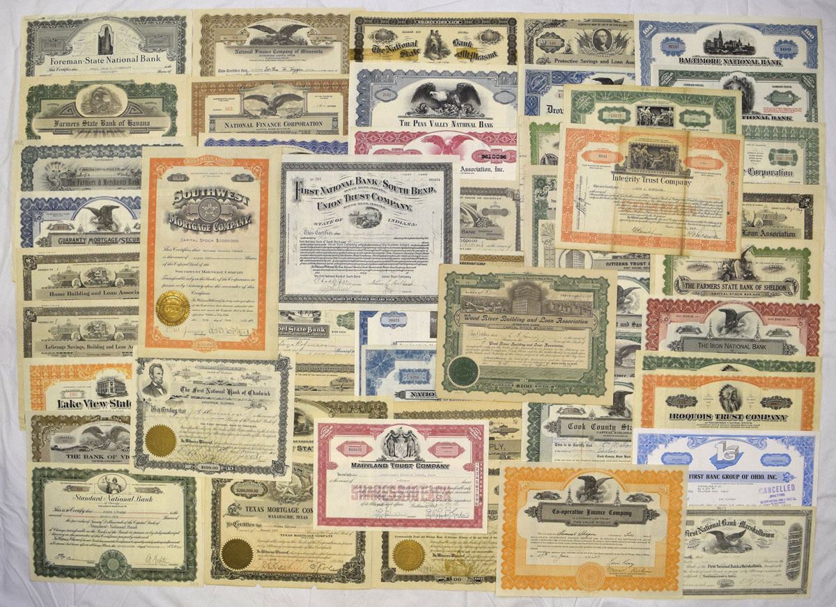 Various States......, Lot of 53 issued stock certificates representing banks, trust companies, savings and loan associations, mortgage firms, and related financial institutions. Notable companies visible in the group include Baltimore National Bank; The Iron National Bank; Foreman-State National Bank; The Penn Valley National Bank; First National Bank of South Bend; Old Colony State Bank; Maryland Trust Company; Iroquois Trust Company; National Mortgage Corporation of Detroit; Southwest Mortgage Company; Farmers State Bank of Sheldon; and Wood River Building and Loan Association, among others. Certificates feature engraved vignettes of eagles, allegorical figures, cityscapes, bank buildings, and classical portraits, with ornate borders, period typography, serial numbers, handwritten signatures, and applied seals. A variety of capital structures and formats are present, including national banks, state banks, trust companies, and building and loan associations. Conditions range from VG to XF overall, with typical folds, cancellations, edge wear, and handling consistent with age. (53). Sold “AS IS” no returns accepted.