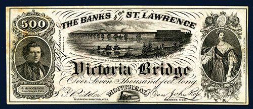 Montreal, Canada, 1857, 500 (Views of….), “Over 7000 feet long”, vignette of bridge in middle, Queen Victoria on right and guide on left, back orange-red with text and “S.Zimmerman Railway King - G.T. Railway, over 800 miles long”, Uncirculated with light toning on top left. J.Sage & Sons.