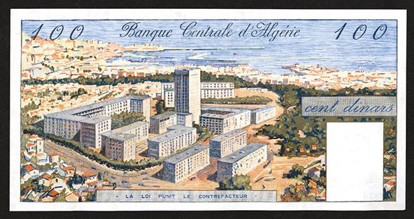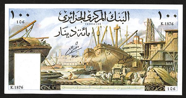 Algeria. 100 Dinars. P-125a. Harbor scene, city view on back. Wonderful large format note. Choice Uncirculated.