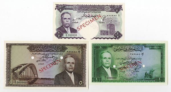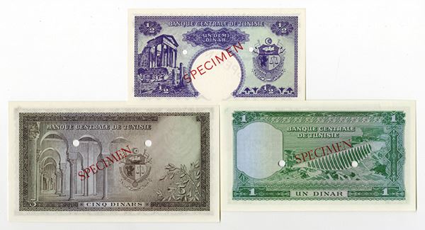 Tunisia, includes 1/2 Dinar, P-57; 1 Dinar, P-58; and 5 Dinars, P-59. All with S/N 000000, overprinted SPECIMEN, and POCs. Very Choice About Uncirculated with minor paper clip traces near top left. (3)