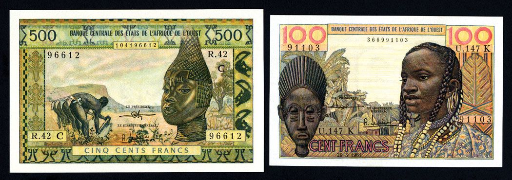 West African States, pair of issued notes, the first 100 Francs, 1961, P-10A; the second 500 Francs, (1959-64), P-102A. Both CU to Gem Uncirculated.