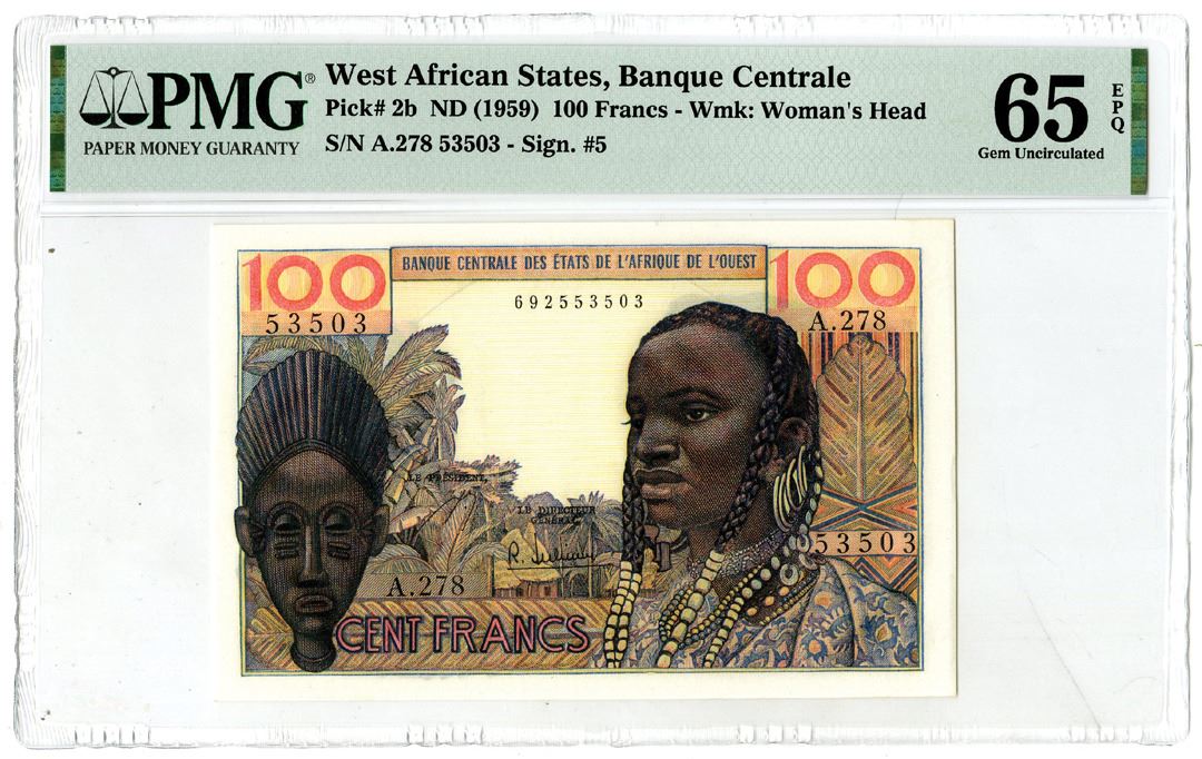 West African States, ND (1959). 100 Francs, P-2b, Issued Banknote. Red and m/c printing with young woman at right and tribal mask at left. S/N A.278 53503. PMG graded Gem Uncirculated 65 EPQ.