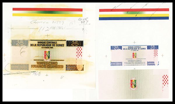 Guinee, 1985, Banque Centrale De La Republique De Guinee Production Proofs. Lot of 3 items in 3 different formats of the 1985 Issue fronts. Includes 6.5 by 3 inches Mockup Model of face of 25 Francs note minus the portrait of the young boy on left with different design elements and text glued or taped onto an underprint proof in red and blue; The underprint proof without anything attached is included and the final note in the correct size, also without portrait of child on left, 4.5 by 2.75 inches. All with color bars on top. Unique proofs in archive. ABNC or USBNC.