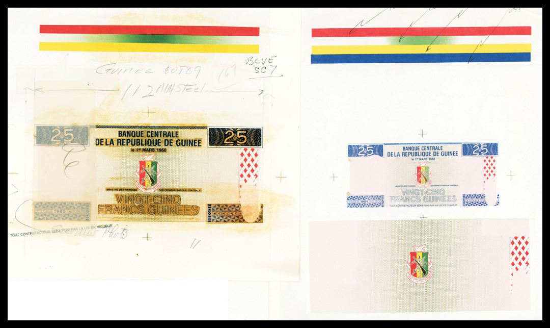 Guinee, 1985, Banque Centrale De La Republique De Guinee Production Proofs. Lot of 3 items in 3 different formats of the 1985 Issue fronts. Includes 6.5 by 3 inches Mockup Model of face of 25 Francs note minus the portrait of the young boy on left with different design elements and text glued or taped onto an underprint proof in red and blue; The underprint proof without anything attached is included and the final note in the correct size, also without portrait of child on left, 4.5 by 2.75 inches. All with color bars on top. Unique proofs in archive. AU condition. ABNC or USBNC.