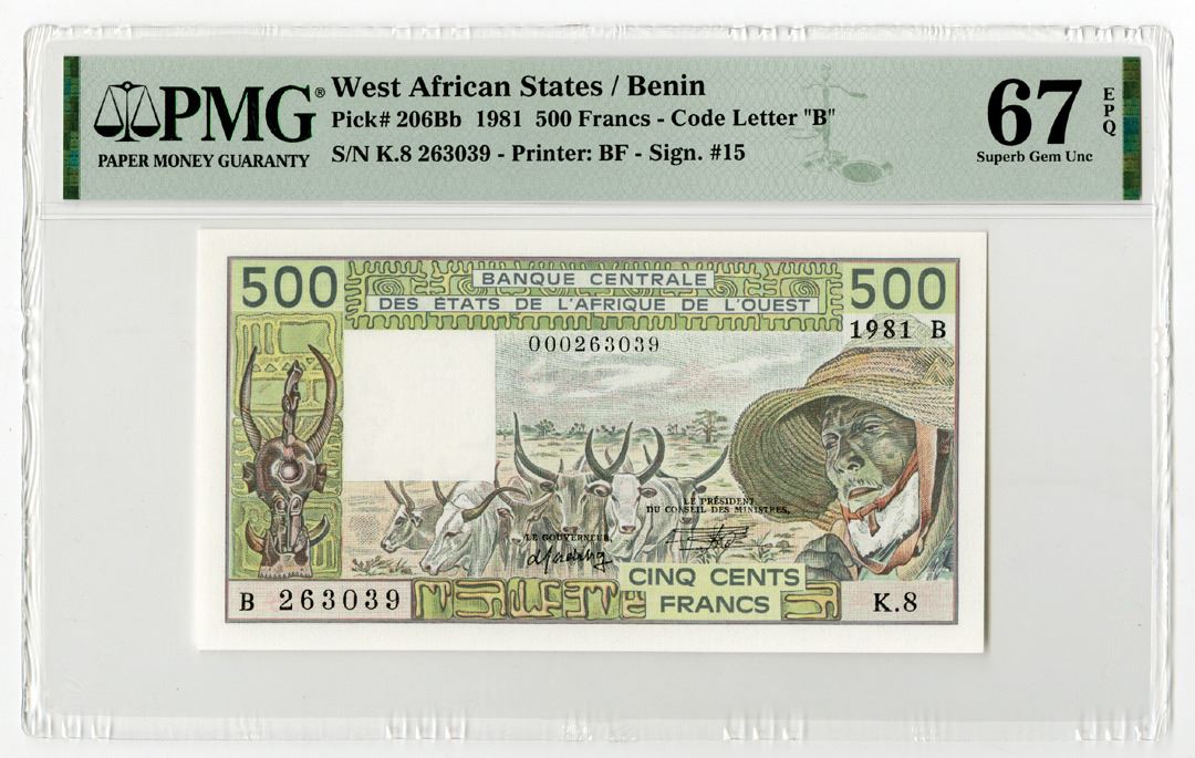 West African States - Benin, 1989, 500 Francs, P-206Bb, Issue Banknote, Code Letter "B", Signature #15, PMG graded Superb Gem Uncirculated 67 EPQ. Printer: BF. Tied as highest graded out of 5 graded in the PMG census.