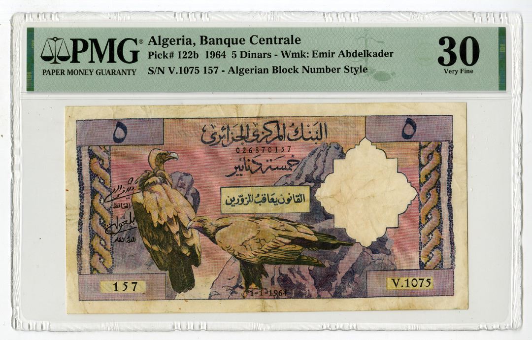 Algeria, 1964. 5 Dinars, P-122b, Issued Banknote, Purple and lilac on m/c printing, Griffon Vulture and Tawny Eagle perched on rocks at center, Back is also purple and lilac on m/c, S/N V.1075 157, PMG graded Very Fine 30.